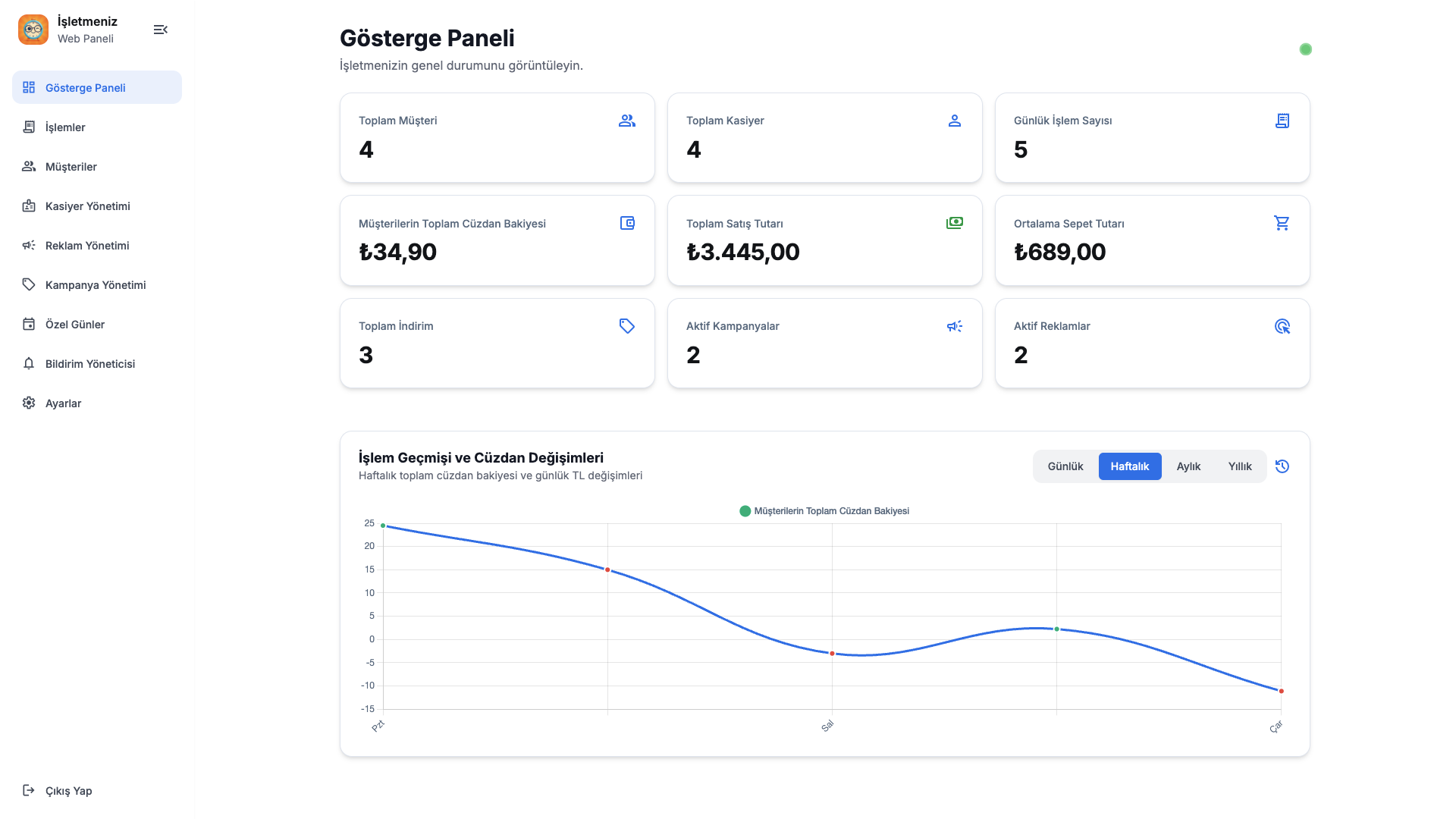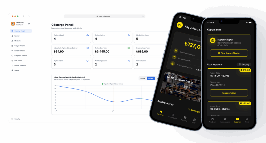 İşletmenin yönetim paneli, kasiyerlerin anlık işlem ekranı ve müşterilere özel mobil uygulamasıyla uçtan uca çalışan, alışverişleri puana dönüştüren akıllı sadakat platformu.
