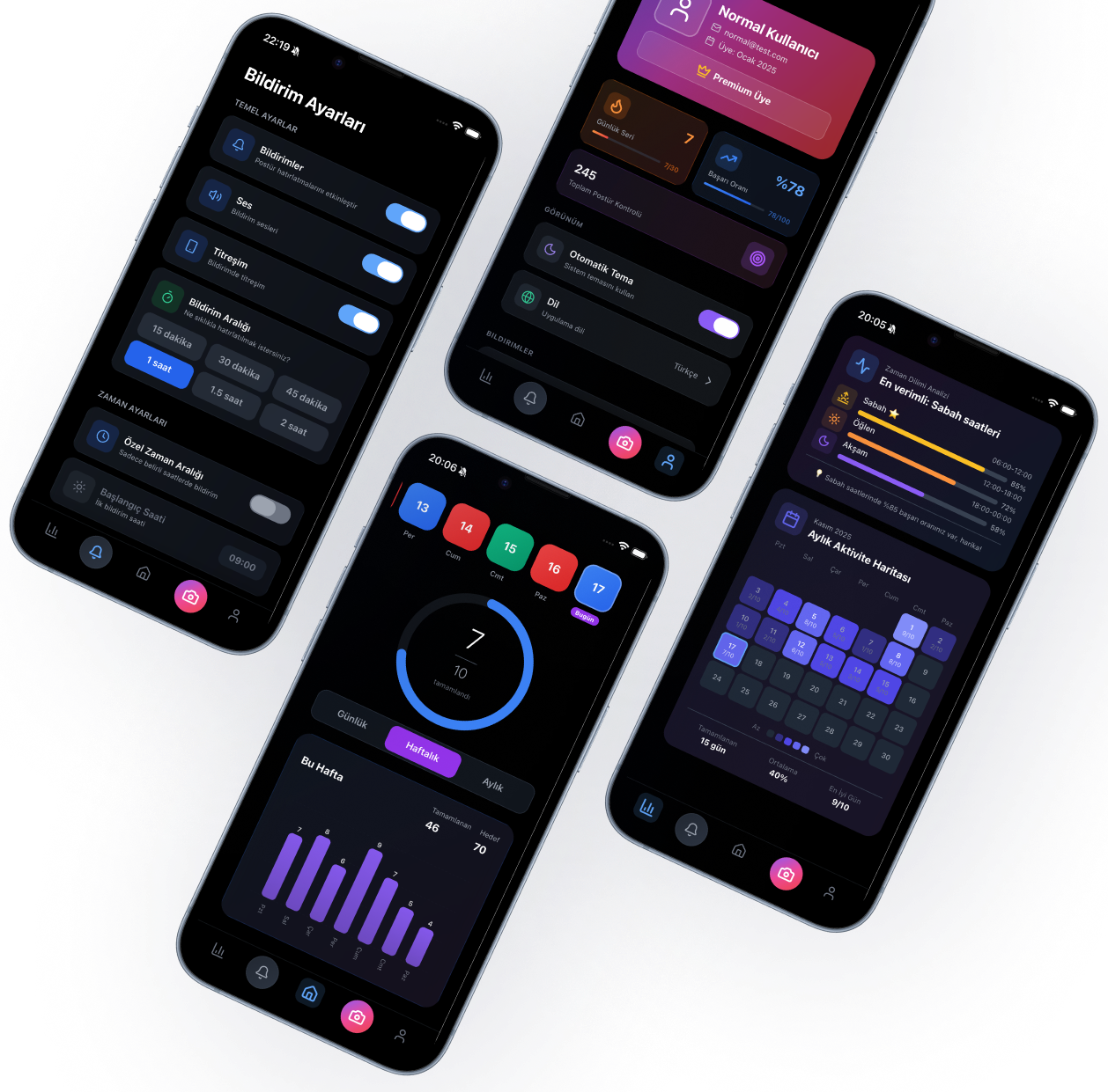 Duruş analizi yapan, yapay zekâ destekli hatırlatmalar ve etkileşimli bildirimlerle postürünü iyileştiren sistem.